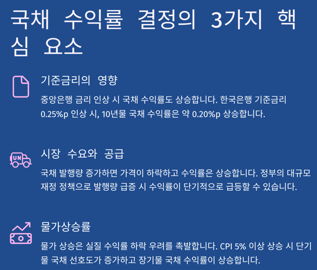 👉 국채 수익률은 단순히 이자율이 아니라 시장 금리, 물가, 경기 전망 등과 연결돼 있어요.