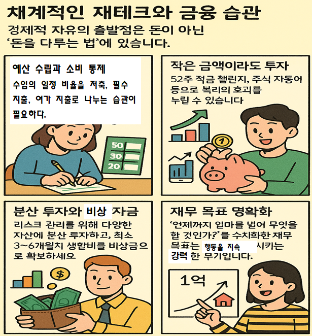 - 분산 투자와 비상자금: 리스크 관리를 위해 다양한 자산에 분산 투자하고, 최소 3~6개월치 생활비를 비상금으로 확보하세요.
